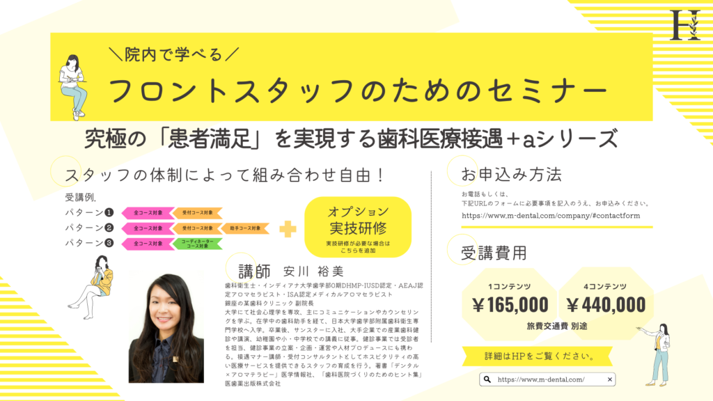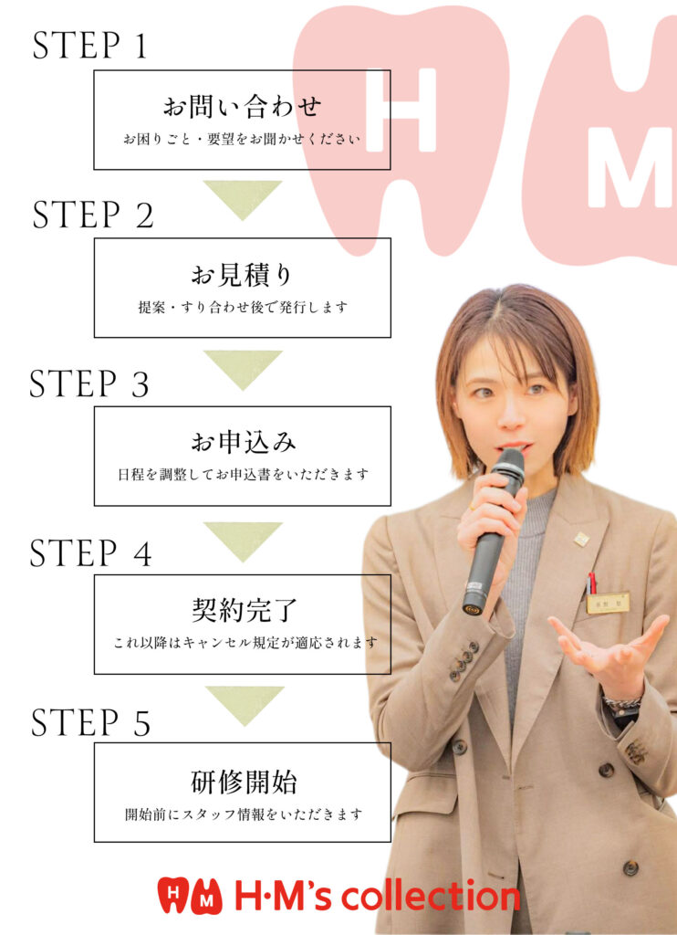 歯科衛生士はもちろん、歯科助手や受付など、各グループが同時に受講できる研修スタイルをご提案いたします。内容はチーム医療や歯科医療接遇、教育・定着・予防歯科の仕組みなど、幅広い分野に対応しております。