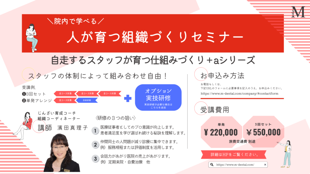 濵田さんが入る前はユニットが3台で医院の売上は平均5000万円でした。初期に人財整備が開始してその後、自費開発などお世話になりました。現在は増築したのもあり年商が6倍の3億超えです。研修中は【報酬は患者さんからの信頼の証で&歯科は口腔を通じて人の口福を増やす。】という言葉をずっと言われてきました。マインドが叶った当院は現在も新院長と急成長中です。